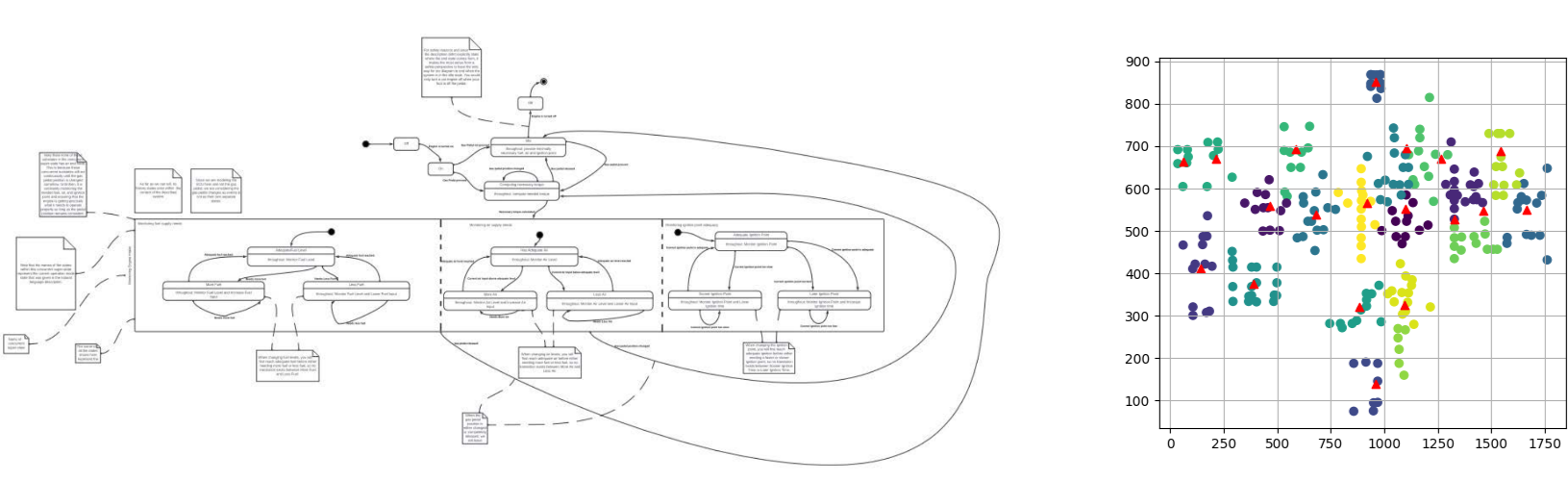 Another challenge came from some initial assumptions I had made, as well as lingering issues from OpenCV. The method often generated center points that were either nonsensical, in large quantities, or both. To address this, I felt it was necessary to cluster the points in an attempt to filter out the noise and improve the data quality. I decided to use K-means clustering, as I knew the number of clusters I needed and hoped it would yield better results. However, this choice wasn’t perfect. K-means is inherently inconsistent, and the resulting clusters often varied significantly from one run to the next. Also, the k-means required outside information that limited the programs actual use with any diagrams not already inside our testing set.